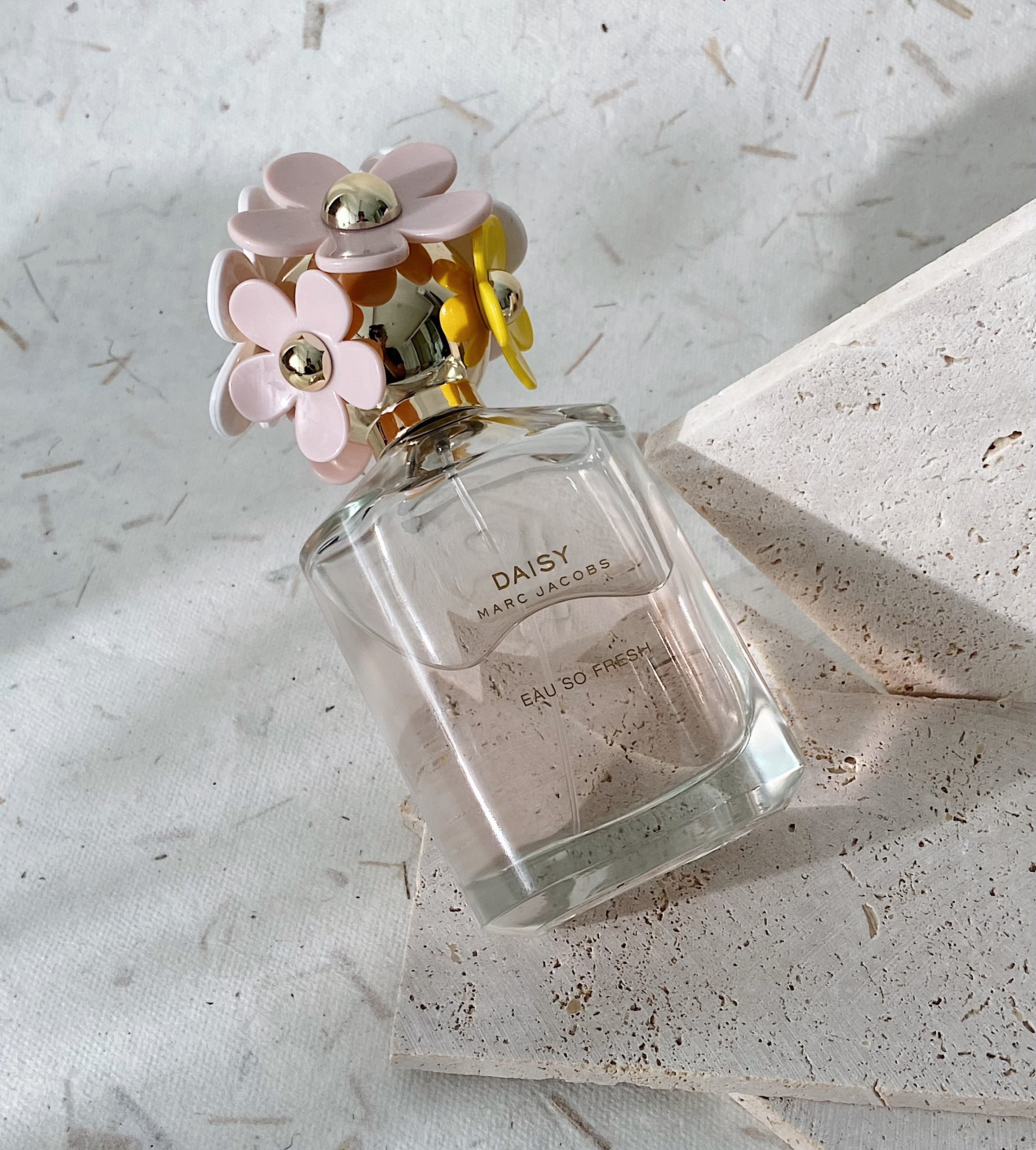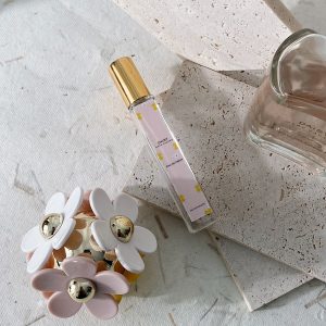 Chai nước hoa Marc Jacobs Daisy Eau So Fresh EDT có thiết kế đáng yêu và tinh tế. Chất liệu chai làm từ thủy tinh trong suốt, có hình dạng hình tròn với các chi tiết hoa nhẹ nhàng và nắp chai màu trắng tạo điểm nhấn nữ tính. Thiết kế này thể hiện phong cách tươi mới và vui tươi của nước hoa.
